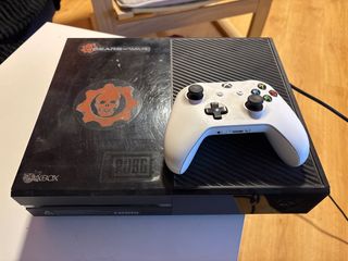 Consola Xbox One in colore nero, con un controller wireless bianco. Design con tematiche di Gears of War e PUBG. Include un controller. Include i giochi GTA 5 e Red Dead Redemption 2.