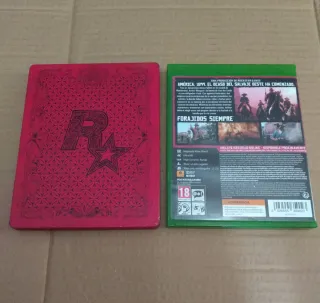 Gioco Red Dead Redemption 2 per Xbox One. Design della scatola metallica rossa con dettagli in nero. Motivo ornamentale su tutta la superficie. Logo di Rockstar Games in basso.