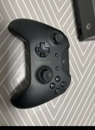 Console Xbox One X con disco rigido da 1TB. Design elegante in colore nero. Capacità di archiviazione da 1TB. Controller Xbox Elite con custodia, grilletti e diversi joystick; il controller è un po' danneggiato. Fifa 20.