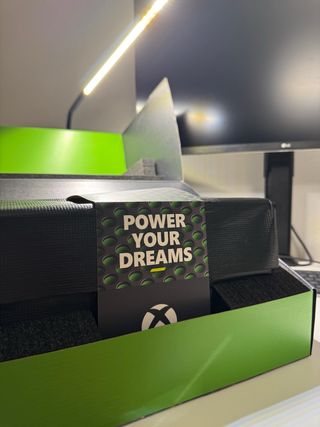 Consola Xbox Series X in colore nero, con un controller verde. Include: - Consola Xbox Series X (con scatola). - Controller verde. - Alcuni giochi come Assassin's Creed Valhalla in formato fisico, altri da confermare.
