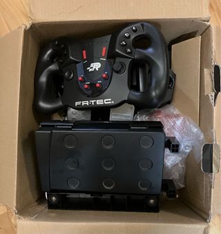 Volante da corsa FR-TEC Suzuka Wheel Elite 3. La scatola è danneggiata ma i componenti no, dovuto al tempo trascorso. Utilizzo molto limitato. Compatibile con PC, PS4, PS3, Xbox Series X/S, Xbox One, Xbox 360 e Switch. Include pedali e leva del cambio.