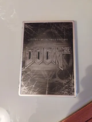 Edizione limitata di Doom 3 per Xbox. - Copertina metallica con finitura graffiata. - Logo DOOM 3 in rilievo. - Testo LIMITED COLLECTOR'S EDITION presente.