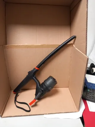Set composto da canna da pesca e mulinello. - Canna da pesca nera con dettagli arancioni. - Mulinello nero con dettagli arancioni. - Laccio di sicurezza nero.