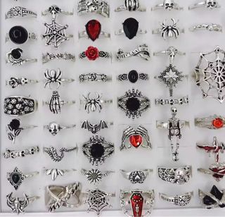 Set di anelli regolabili con design unici. - Anello con croce nera - Anello con corona - Anello con cuore nero - Anello con pietra bianca - Anello con decorazioni floreali