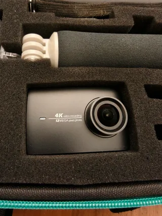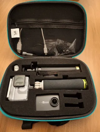 Action cam Yi 4K completa di tutti gli accessori originali, pronta per l'uso. - Custodia impermeabile inclusa. - Impugnatura estensibile. - Supporto per manubrio. - Cavi di ricarica e connessione. - Cover in metallo