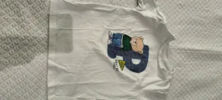 Maglietta bianca per neonato con una simpatica stampa. - Stampa di un orsetto con jeans e felpa verde. - Scritta JUST BE COOL! e logo giallo. - Design divertente e colorato.