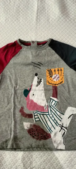Maglietta a maniche lunghe per neonato con una simpatica stampa. - Maniche raglan in colore bordeaux e blu scuro. - Stampa di una volpe con guantone da baseball. - Chiusura con bottone sul collo.