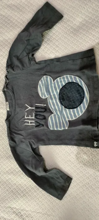 Maglietta a maniche lunghe per neonato con una simpatica stampa. - Colore grigio scuro. - Stampa Hey You! con applicazione a forma di orsetto. - Applicazione con righe azzurre e cerchio a pois.