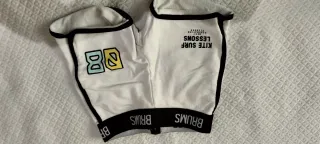 Pantaloncini da bambino firmati Brums, colore bianco. - Elastico in vita con logo BRUMS. - Scritta KITE SURF LESSONS su una gamba. - Grafica BB sull'altra gamba. - Bordi neri a contrasto.