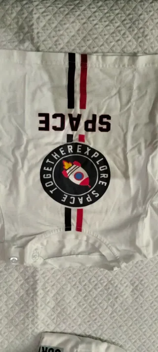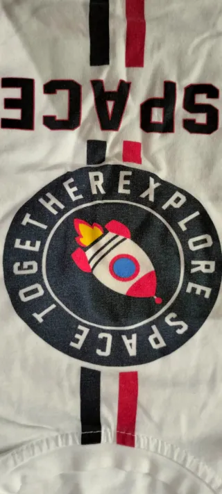 Maglietta bianca per neonato con stampa a tema spaziale. - Stampa SPACE in nero. - Cerchio con razzo TOGETHER WE EXPLORE SPACE. - Strisce verticali nere, rosse e blu sul davanti.