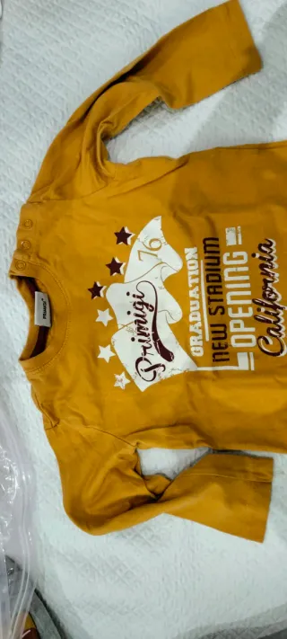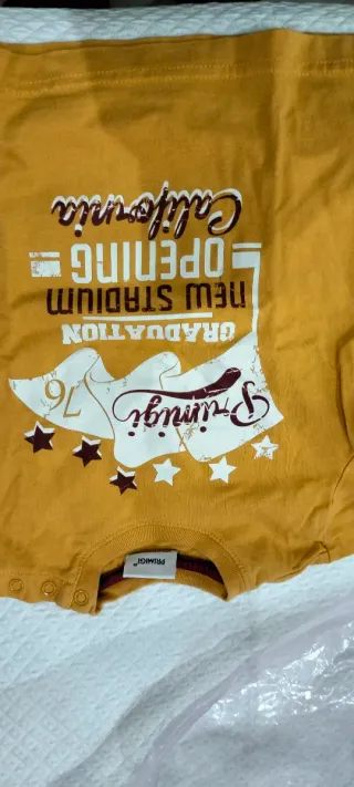 Maglietta a maniche corte per neonato con stampa. - Colore: Giallo ocra - Stampa California Opening New Stadium Graduation 76 Primigi - Chiusura con bottoni a pressione sulla spalla - Dettagli con stelle