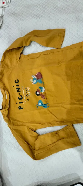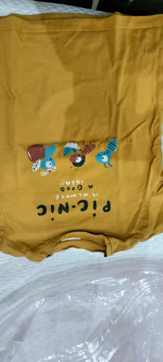 Maglietta a maniche lunghe per neonato di colore giallo ocra. - Stampa colorata sul davanti con tema Picnic is always a good idea. - Personaggi stilizzati a tema insetti e frutta.