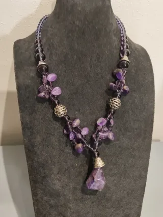 Elegante collana realizzata con ametista grezza e perle. - Pietre di ametista grezza. - Perle in vetro. - Elementi decorativi in metallo argentato.