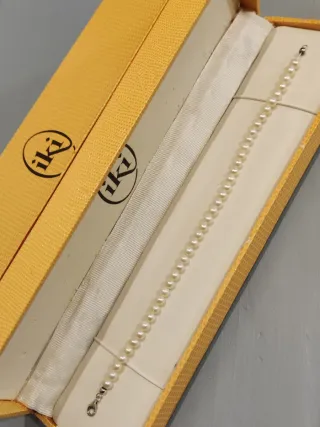 Elegante braccialetto con perle e chiusura in oro bianco. - Perle luminose. - Chiusura sicura in oro bianco. Bracciale marca iki di perle giapponesi da 5 mm con chiusura in oro bianco 750. Garanzia e scatole comprese. Il filo è leggermente allentato e la scatola è un po' rovinata (vedi foto)