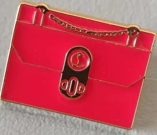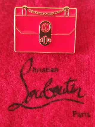Spilla a forma di borsa Christian Louboutin, un accessorio iconico. - Colore rosso vivace. - Dettagli dorati. - Design a forma di borsa con catenella. Pins Christian Louboutin con sacchetto.
