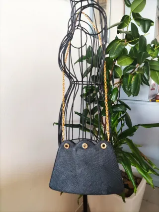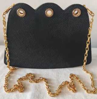 Elegante borsetta Valentino Garavani Night, vintage con dettagli dorati. - Materiale esterno in tessuto nero. - Catena a tracolla color oro. - Dettagli con strass sui passanti. Borsetta Valentino Garavani Night, in tela lavorata nera e accessori oro, si può portare a tracolla o usare come pochette, la catena è removibile e gli agganci sono a scomparsa. Alta 16 cm, larga 23 cm, profonda 6 cm circa. Mancano due borchie all' interno (vedi foto) dall' esterno non si nota. No dust bag.