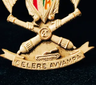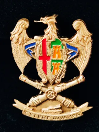 Spilla da collezione Fratelli Lorioli Milano 121raffigurante un'aquila con scudo e cannoni incrociati. - Aquila dorata con ali spiegate. - Scudo centrale con croce rossa e elementi verdi e arancioni. - Due cannoni incrociati sotto lo scudo. - Numero 20 al centro dei cannoni. - Nastro con iscrizione CELERE AVVAMPA e un carro armato. - Realizzata da Fratelli Lorioli.