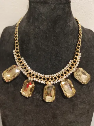 Elegante collana con strass e pietre decorative. - Design a catena dorata. - Dettagli scintillanti. - Pietre rettangolari color oro. Mancano due strass, vedi foto
