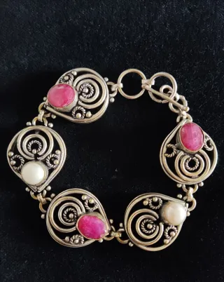 Elegante bracciale vintage con un design unico. - Decorato con pietre di radice di rubino - Inserti di perle bianche. - Finitura in argento lavorato con motivi a spirale. Nel mio armadio puoi trovare anche il pendente