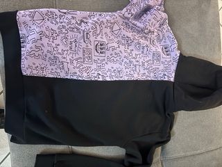 Felpa con cappuccio per ragazzo, con un design unico. - Parte superiore nera con firma Keith Haring. - Parte inferiore con stampa grafica colorata. - Cappuccio integrato.