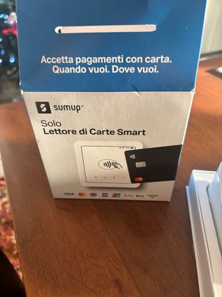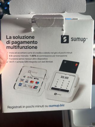 Lettore di carte SumUp Solo POS, ideale per pagamenti multifunzione. - Accetta carte di credito e debito. - Nessun canone mensile. - Commissione per transazione del 1.95%. - Funziona senza bisogno di altri dispositivi. - Wi-Fi e SIM integrata con dati illimitati.
