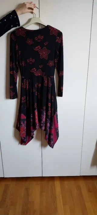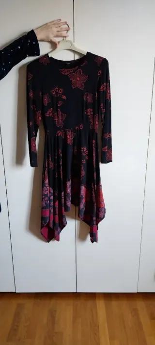 Abito midi con stampa floreale e asimmetrico. - Maniche lunghe. - Orlo asimmetrico. - Stampa floreale rossa su fondo nero.