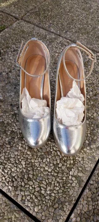 Eleganti scarpe con tacco color argento. - Modello con cinturino alla caviglia. - Dettaglio lucido. Tacco cm 7. Due leggeri segni di usura scarpa dx, invisibili quando indossate (vedi foto)