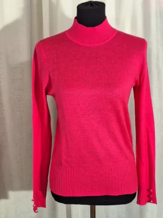 Maglia girocollo da donna in un vivace colore fucsia. Presenta un design elegante con polsini decorati. - Maniche lunghe - Collo alto - Dettagli sui polsini