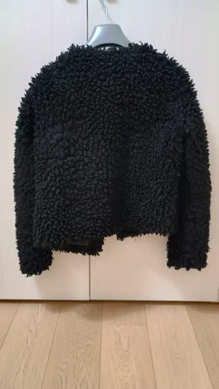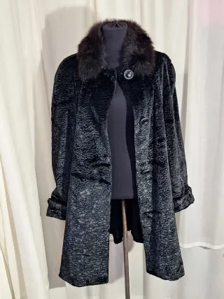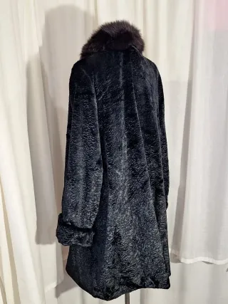 Elegante cappotto in pelliccia ecologica nera, con un colletto in pelliccia scura. Ascelle 62 ,spalle 48 cm, lunghezza 94 cm, - Design classico e raffinato. - Materiale morbido e caldo al tatto. - Finiture curate sui polsini e sul fondo.