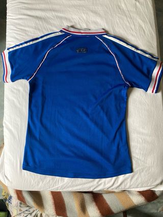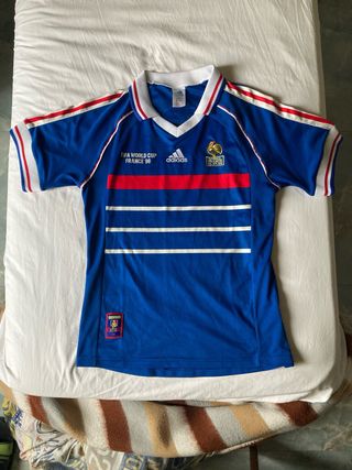 Maglietta da calcio della nazionale francese, edizione FIFA World Cup 1998. - Colore blu con dettagli rossi e bianchi. - Logo Adidas e stemma della Francia sul petto. - Scritta FIFA WORLD CUP FRANCE 98 sul davanti.