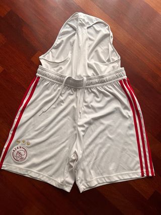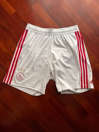 Pantaloncino da calcio dell'Ajax, taglia M. Design bianco con le iconiche tre strisce rosse sui lati. - Logo ufficiale Ajax Amsterdam. - Strisce Adidas sui lati.