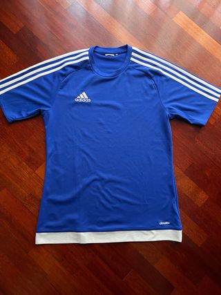 T-shirt sportiva Adidas di colore blu. - Logo Adidas sul petto. - Tre strisce bianche sulle maniche. - Dettaglio climalite sul fondo.