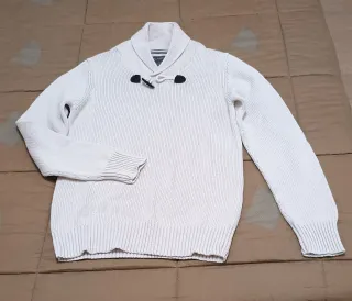 Maglione da uomo in cotone, con scollo a scialle e chiusura con alamaro. - Tessuto in cotone - Dettagli neri - Taglia M