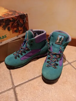 Scarponcini da trekking originali anni ’90 del marchio italiano Cosmas, modello “Mountain Shoes”. Colore iconico turchese e viola, tipico dello stile outdoor di quegli anni. 🔹 Condizioni: praticamente nuovi, indossati pochissime volte. 🔹 Taglia: 40 (vestibilità regolare). 🔹 Dotazione: con scatola originale in ottimo stato. 🔹 Made in Italy, qualità artigianale e materiali resistenti. Perfetti per chi ama l’abbigliamento vintage outdoor, per collezionisti o per un look retrò da montagna. Difficili da trovare in queste condizioni! 💰 Prezzo: 95 € 📦 Spedizione sicura e imballaggio accurato.
