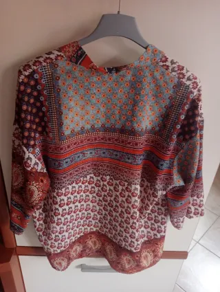 Camicia da donna con una vivace fantasia. Spalla cadente, dietro più lunga. - Design patchwork con motivi floreali e paisley. - Scollo a V. - Maniche ampie.
