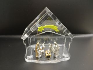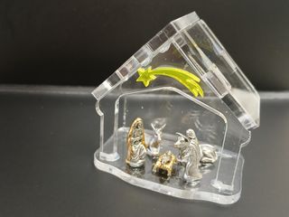 Mini Presepe moderno realizzato in acrilico trasparente, con una stella cometa decorativa e statuine in scala 1:60 realizzate in zama trattate argento antico. Dimensione 70 mm x 45 mm H=70 mm Prodotto totalmente ITALIANO E ARTIGIANALE - Design minimalista e contemporaneo. - Include le figure del presepe in Zama trattata argento antico - Materiale: acrilico-Plexiglass