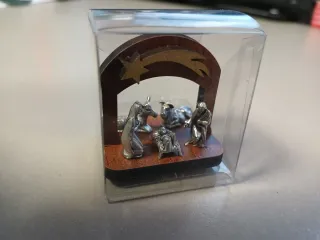 Mini presepe moderno realizzato in legno, con una stella cometa decorativa e statuine in scala 1:100 realizzate in zama trattate argento antico. Dimensione 40 mm x 30 mm H=40 mm Prodotto totalmente ITALIANO E ARTIGIANALE - Sagoma in legno con stella cometa. - Figure del presepe in metallo. - Base in legno.