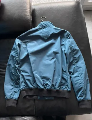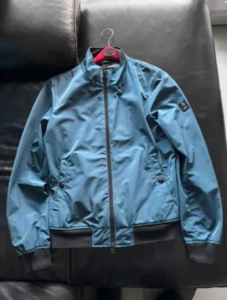 Giubbotto antivento Refrigue taglia M colore blu da uomo, usato ed in buono stato, comodissimo in autunno e primavera, con dettagli manica e girovita in tessuto. - Zip frontale. - Tasche laterali con bottoni. - Polsini e fondo elasticizzati.