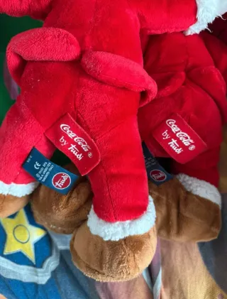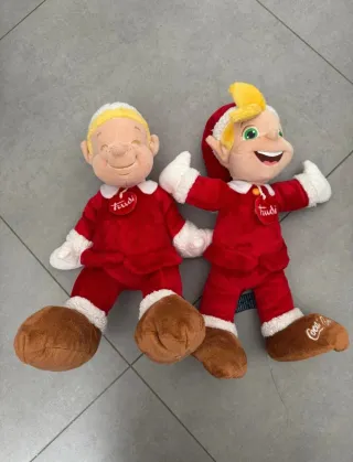 Pupazzo/peluche Trudy Elfo di babbo natale Coca Cola tenuto benissimo, da collezione, originale come da etichetta. Venduti a coppia €60, oppure singoli 30€ ognuno. - Personaggi vestiti con abiti rossi e bianchi. - Dettagli ricamati sui volti. - Logo Coca-Cola su una delle scarpe.