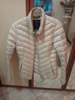 Giacchino imbottito vera piuma d'oca in un bel colore beige. - Design trapuntato. - Collo alto. - Chiusura con zip frontale. - Tasche laterali e 2 interne - Logo sul braccio.