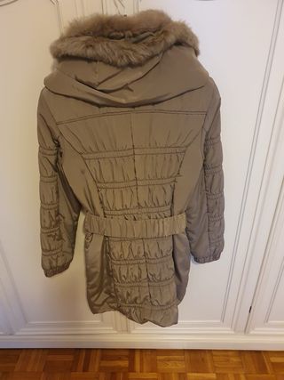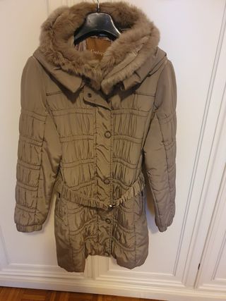 Elegante piumino Conbipel color beige, perfetto per le giornate più fredde. Presenta un cappuccio bordato in pelliccia sintetica. - Chiusura con bottoni. - Cintura in vita elasticizzata. - Maniche lunghe. - Dettagli trapuntati.