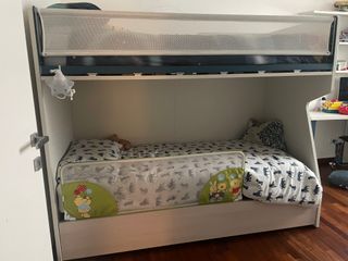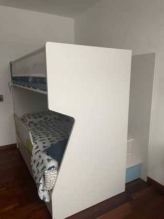Letto a soppalco per bambini, Moretti Compact, ideale per ottimizzare lo spazio. - Struttura robusta e sicura - Rete di protezione per il letto superiore e inferiore - Scalini con cassetti contenitore - Mensola sul letto in alto per lampade ecc - Altro cassettone contenitore in alto che fa anche da piattaforma (larga 40cm) per camminare, rifare il letto - Cassettone a ribalta sotto il letto in basso con altri due grandi contenitori estraibili con ruote - Lunghezza totale 214 cm - Larghezza 140 cm + 26 cm di apertura cassettone - Altezza 174 cm. Possibilità di dividere costi di smontaggio/trasporto/montaggio