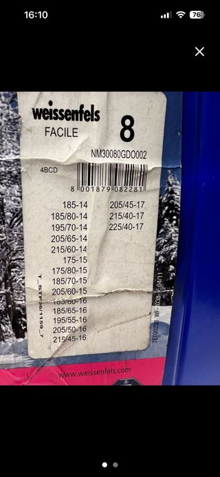 Set di catene da neve Weissenfels modello Facile, misura 8. Ideali per affrontare condizioni invernali difficili. - Montaggio rapido in 3 minuti. - Bassa vibrazione. - Design semplice e resistente. - Ingombro massimo di 9 mm. - Adatte anche per veicoli dotati di ABS.
