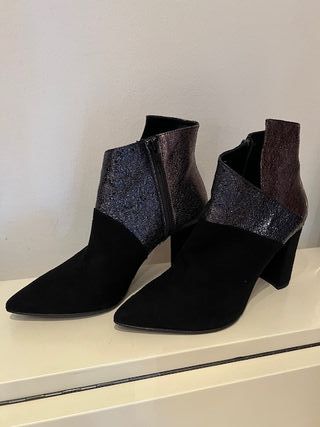 Elegante stivaletto da donna con un design unico. - Materiali misti con finiture metallizzate. - Dettagli glitterati. - Tacco robusto.