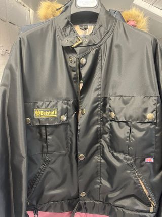 Giacca da uomo Belstaff in colore nero, ideale per la moto e per proteggersi dal vento. - Logo Belstaff sul taschino. - Dettaglio bandiera Union Jack. - Cappuccio con pelliccia sintetica.