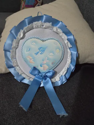 Fiocco nascita decorato con un tenero disegno a tema. - Cuore centrale con coniglietti, aquilone e sole. - Bordi in raso azzurro e pizzo bianco. - Fiocco azzurro sul fondo.
