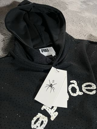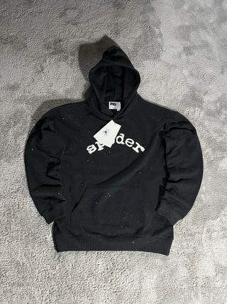 Felpa con cappuccio Sp5der, un capo dallo stile unico. - Tessuto nero con dettagli glitterati. - Design con cappuccio e tasca frontale.