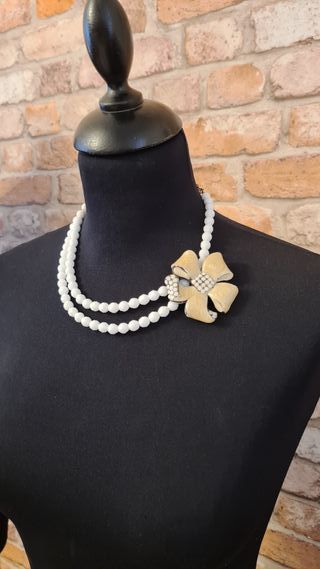 💎 Collana vintage firmata BABYLON Paris con doppia fila di perline bianche e grande pendente laterale a fiore in metallo smaltato. ✨ Design elegante e scenografico, tipico bijoux francese d’epoca. 🌸 Pendente in metallo color avorio con firma BABYLON incisa sul retro. 🔗 Chiusura regolabile con piccola targhetta BABYLON sulla catena. 📜 Epoca vintage anni 80/90, autentico pezzo da collezione. 🤍 Ottime condizioni vintage, normali segni del tempo coerenti con l’età. Lunghezza: vedi foto con metro