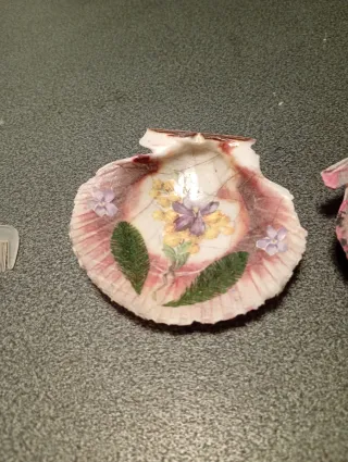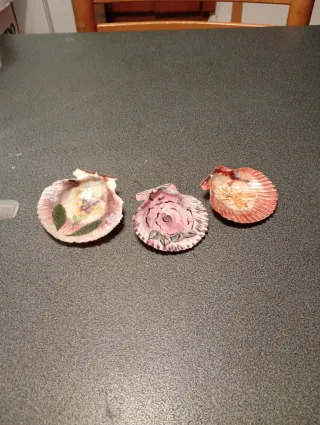Set di tre conchiglie decorate a mano con motivi floreali. - Decorazioni floreali dipinte. - Ideali come soprammobili o per decorazioni a tema marino.