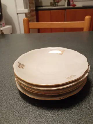 Set di 5 piattini in porcellana con un delicato motivo floreale dorato. - Design elegante con bordo ondulato. - Ideali per accompagnare le tazze.